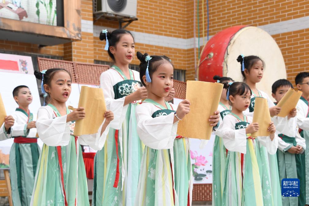 8月30日,廣西河池市羅城仫佬族自治縣第二小學(xué)學(xué)生在“開(kāi)筆禮”上誦讀古詩(shī)。