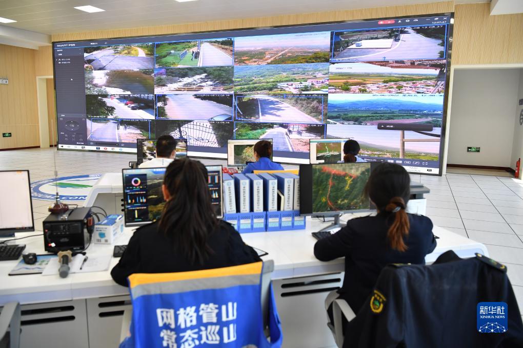 西安市鄠邑區秦嶺保護總站的工作人員在信息化大廳內工作(2022年5月6日攝)。