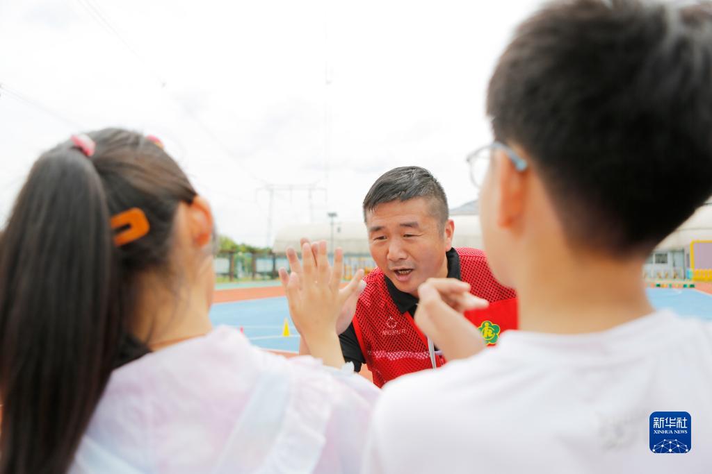 8月30日,在江蘇揚州寶應縣小天使幼兒園籃球場(chǎng),志愿教練與小朋友擊掌慶祝。