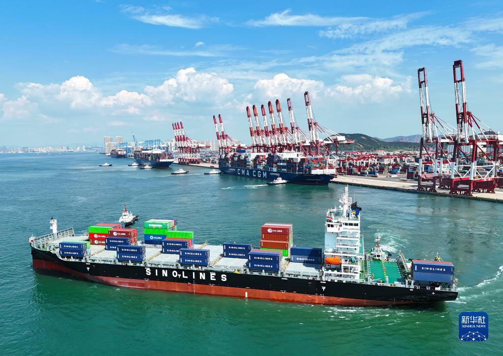 8月30日,“中外運??凇陛喚従忨傠x山東港口青島港(無(wú)人機照片)。