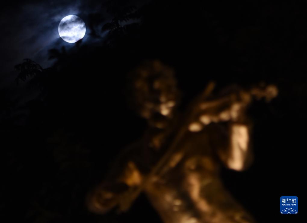 這是8月30日在奧地利維也納城市公園內的施特勞斯雕像前拍攝的“超級月亮”。