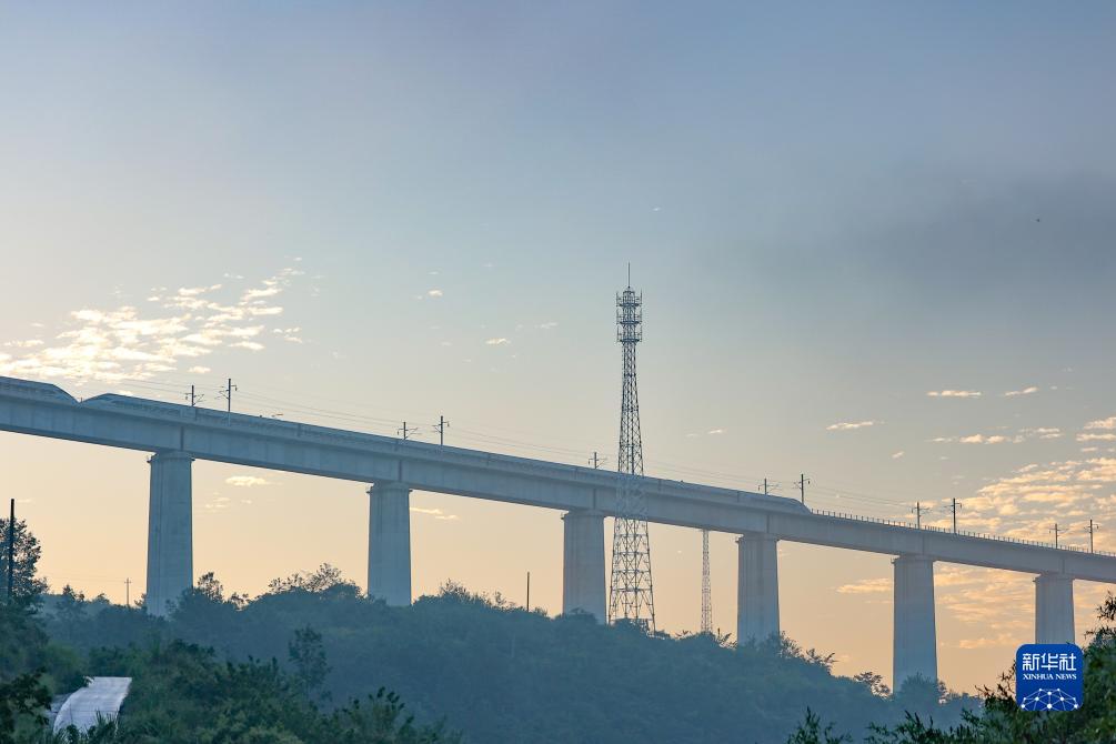 8月31日,一列動(dòng)車(chē)組在晨曦中經(jīng)過(guò)位于貴州省獨山縣郊外的貴南高鐵銀坡河特大橋。