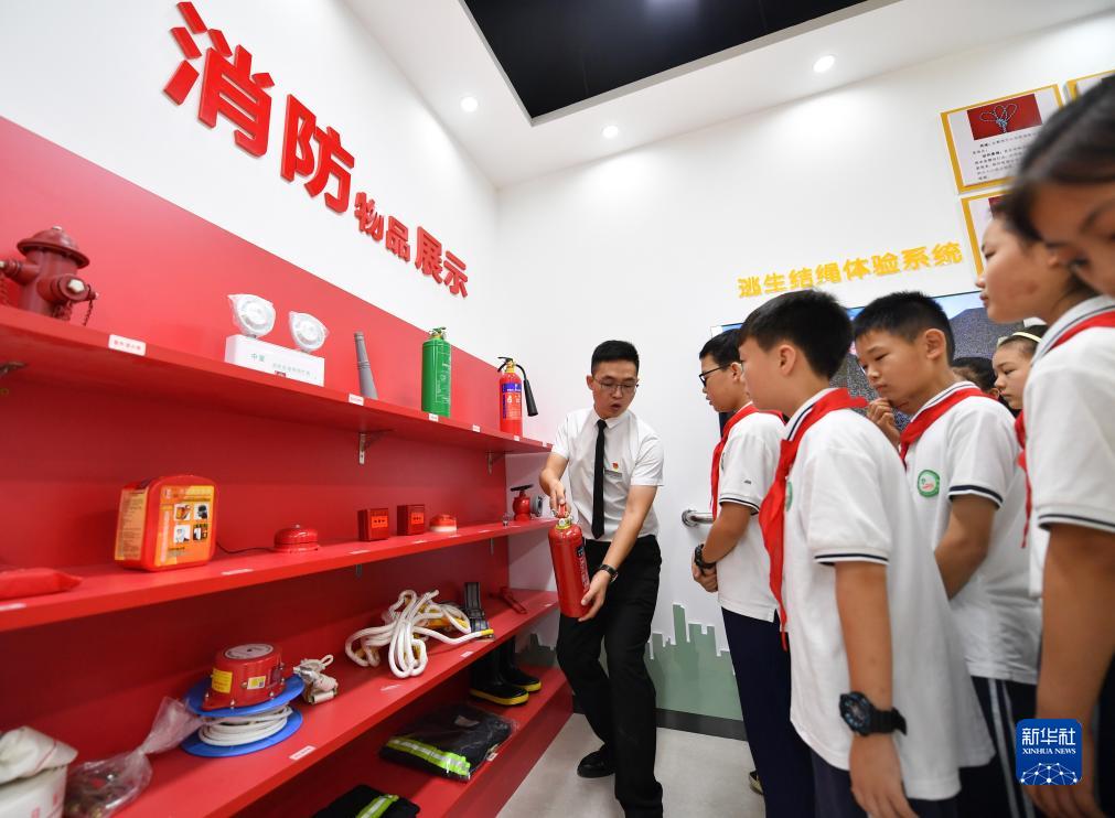 8月31日,在西安市鄠邑區新區小學(xué),學(xué)生在老師的指導下了解消防器材使用方法。