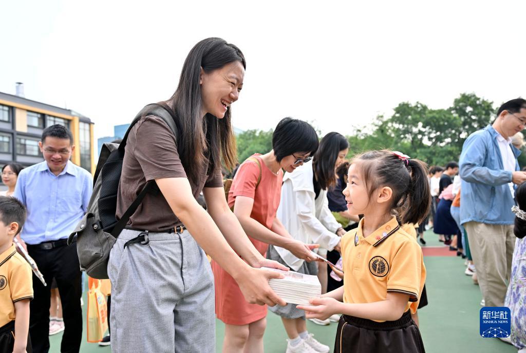 8月31日,北京第二實(shí)驗小學(xué)為一年級新生舉辦開(kāi)筆禮。這是家長(cháng)在開(kāi)筆禮上向孩子贈送書(shū)籍。