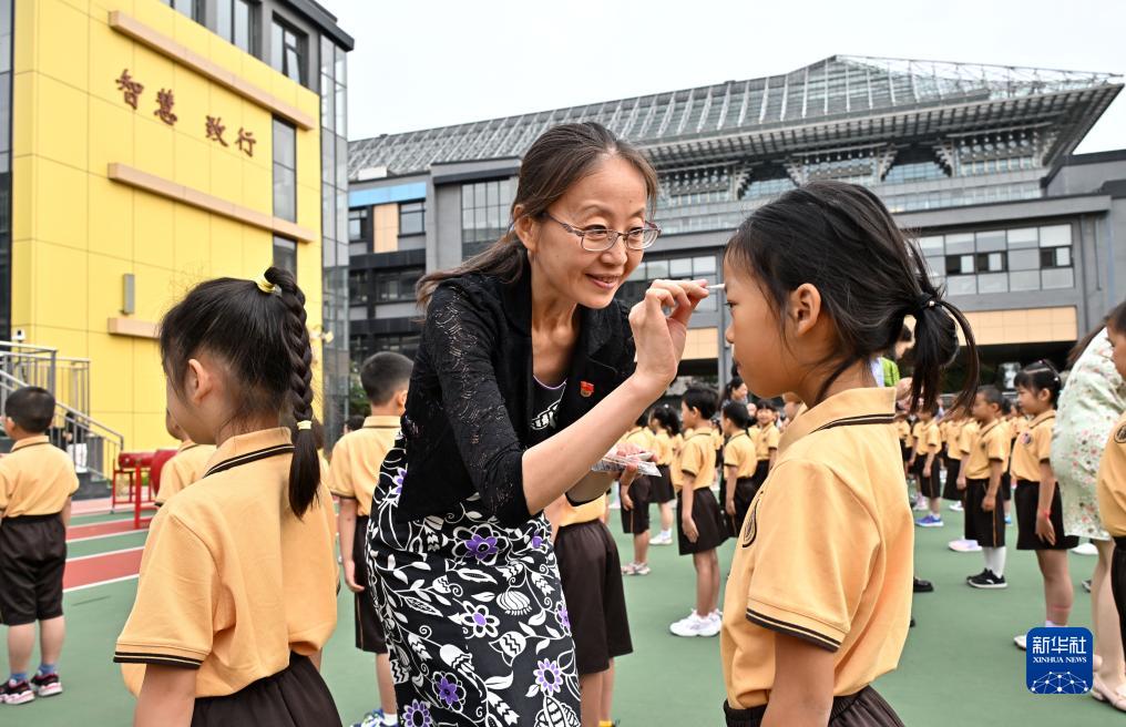 8月31日,北京第二實(shí)驗小學(xué)為一年級新生舉辦開(kāi)筆禮。這是老師在開(kāi)筆禮上為學(xué)生點(diǎn)朱砂啟智。