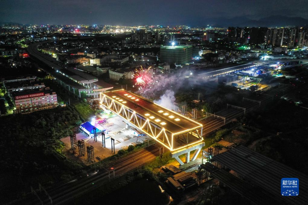 8月31日,莞番高速上跨廣深鐵路主橋轉體完成(無(wú)人機照片)。