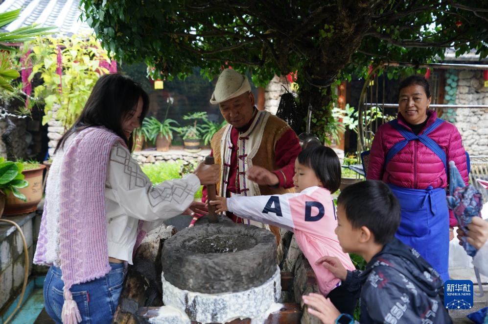 麗江市玉龍納西族自治縣白沙鎮玉湖村村民和杰林(左二)在自家的納西文化體驗館帶游客體驗磨豆花(8月28日攝)。