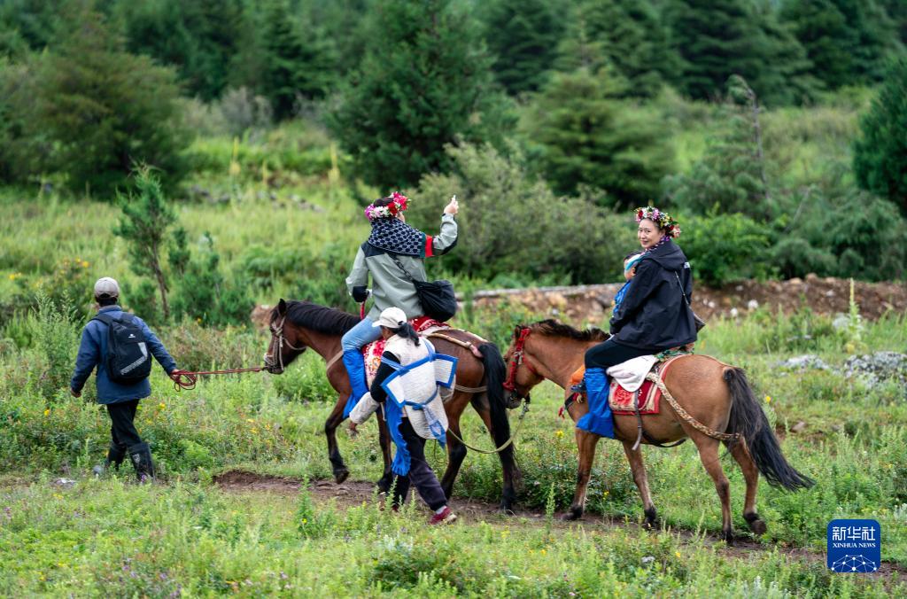 游客在麗江市玉龍納西族自治縣白沙鎮玉湖村體驗騎馬(8月28日攝)。