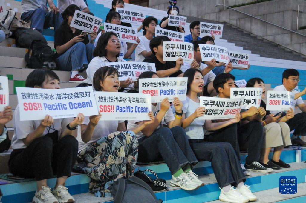 當日,韓國市民團體在首爾光化門(mén)廣場(chǎng)附近舉行集會(huì ),抗議日本核污染水排海。