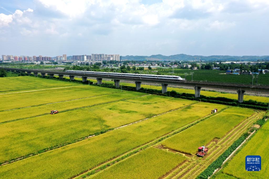 8月31日,在四川省眉山市東坡區太和鎮永豐村,村民駕駛機械收割稻谷(無(wú)人機照片)。