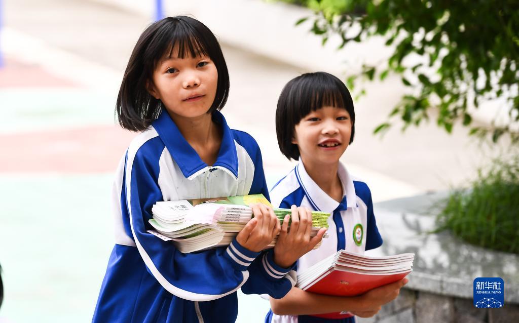 9月1日,海南省瓊中黎族苗族自治縣高田小學(xué)學(xué)生領(lǐng)取課本后走回教室。