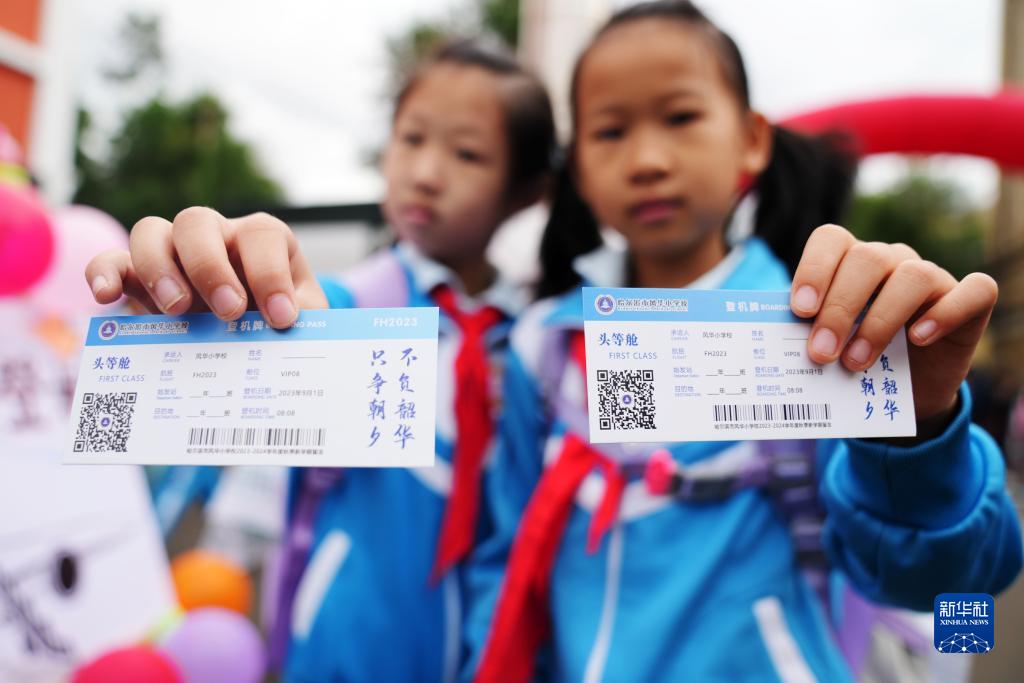 9月1日,哈爾濱市風(fēng)華小學(xué)到校學(xué)生展示剛收到的新學(xué)期“登機牌”。