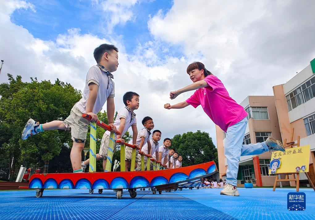 9月1日,浙江省寧波市鎮海區澥浦鎮中心幼兒園小朋友跟隨老師學(xué)習當地民俗運動(dòng)“旱地泥艋”。