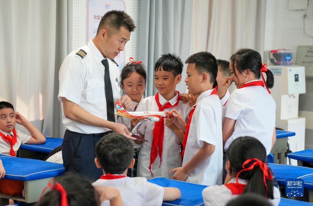 9月1日,在全國航空特色學(xué)校重慶市九龍坡區鐵路小學(xué)開(kāi)學(xué)第一課的課堂上,來(lái)自重慶航空的飛行員手持模型飛機為六年級學(xué)生講解客機的飛行原理。