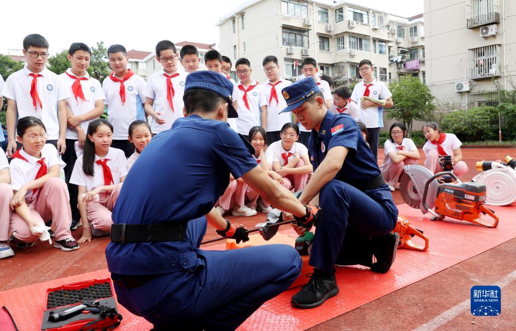 9月1日,上海市長(cháng)寧區消防救援支隊消防員在轄區內姚連生中學(xué)為同學(xué)們演示用于火場(chǎng)救援的鋼筋切割器。