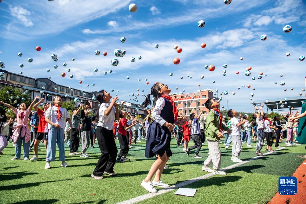 9月1日,在重慶市石柱土家族自治縣三河鎮三河小學(xué),學(xué)生們在操場(chǎng)上拋出足球迎接開(kāi)學(xué)。