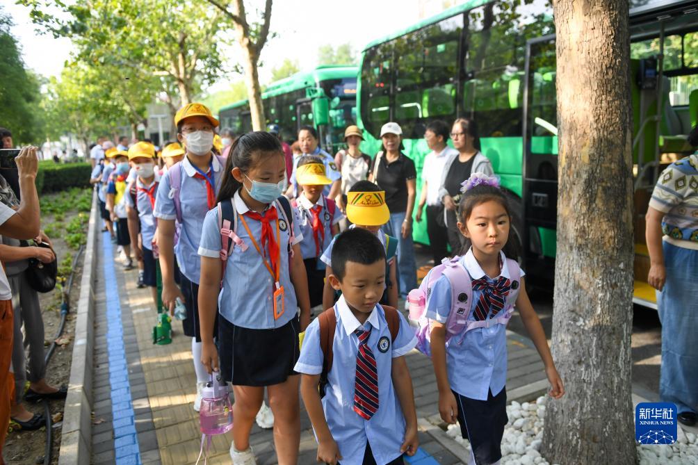 9月1日,在北京市豐臺區第一小學(xué)外,乘坐通學(xué)公交車(chē)到達的學(xué)生在老師的指引下排隊入校。