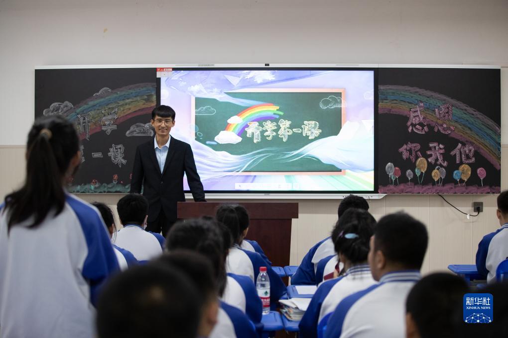 9月1日,在哈爾濱市延壽縣第四中學(xué),一名教師在開(kāi)學(xué)第一課上講述校園重建的經(jīng)過(guò)。