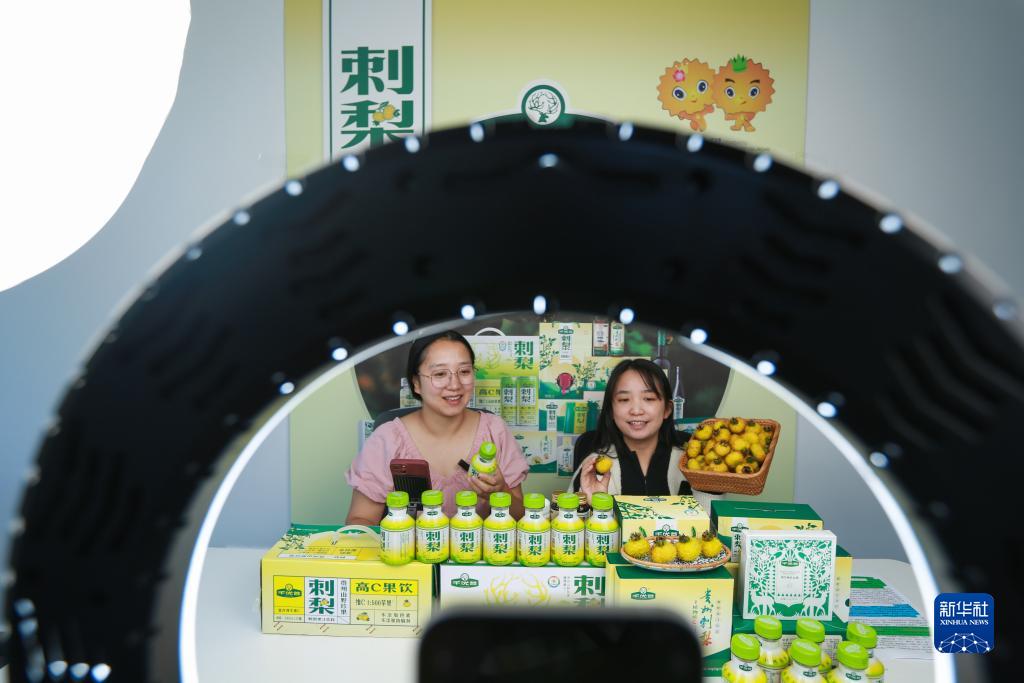 9月1日,在貴州省龍里縣谷腳鎮茶香村刺梨展銷(xiāo)中心,當地政府工作人員與刺梨基地工作人員直播推介刺梨產(chǎn)品。
