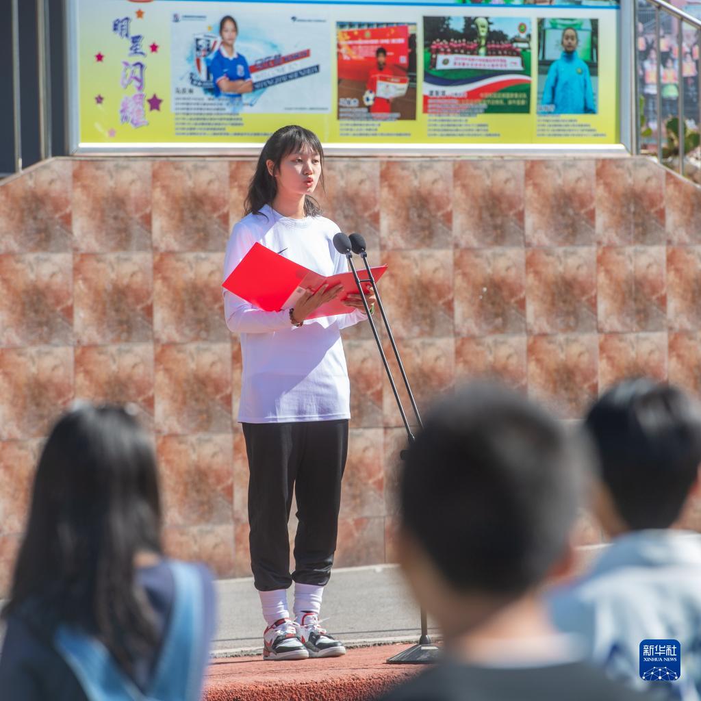 9月1日,在重慶市石柱縣三河鎮的三河小學(xué),曾經(jīng)的留守兒童女足隊隊員秦芙蓉在開(kāi)學(xué)典禮上用自己因足球特長(cháng)考上大學(xué)的事例激勵學(xué)生。