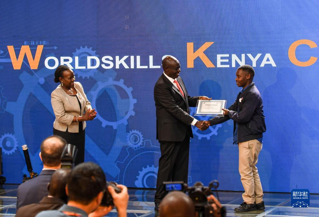 8月31日,在肯尼亞首都內羅畢,肯尼亞副總統里加西·加查瓜(中)為第八屆非洲職業(yè)技能挑戰賽閉幕式的獲獎選手頒發(fā)證書(shū)。