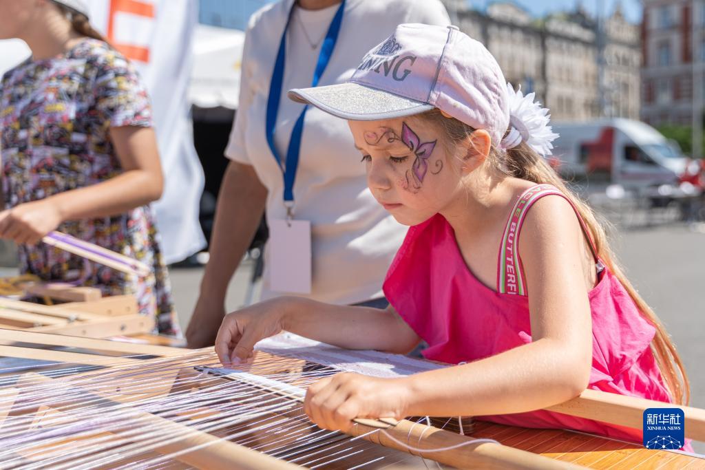 9月2日,在俄羅斯符拉迪沃斯托克舉辦的“知識日”活動(dòng)上,一名兒童學(xué)習織布。