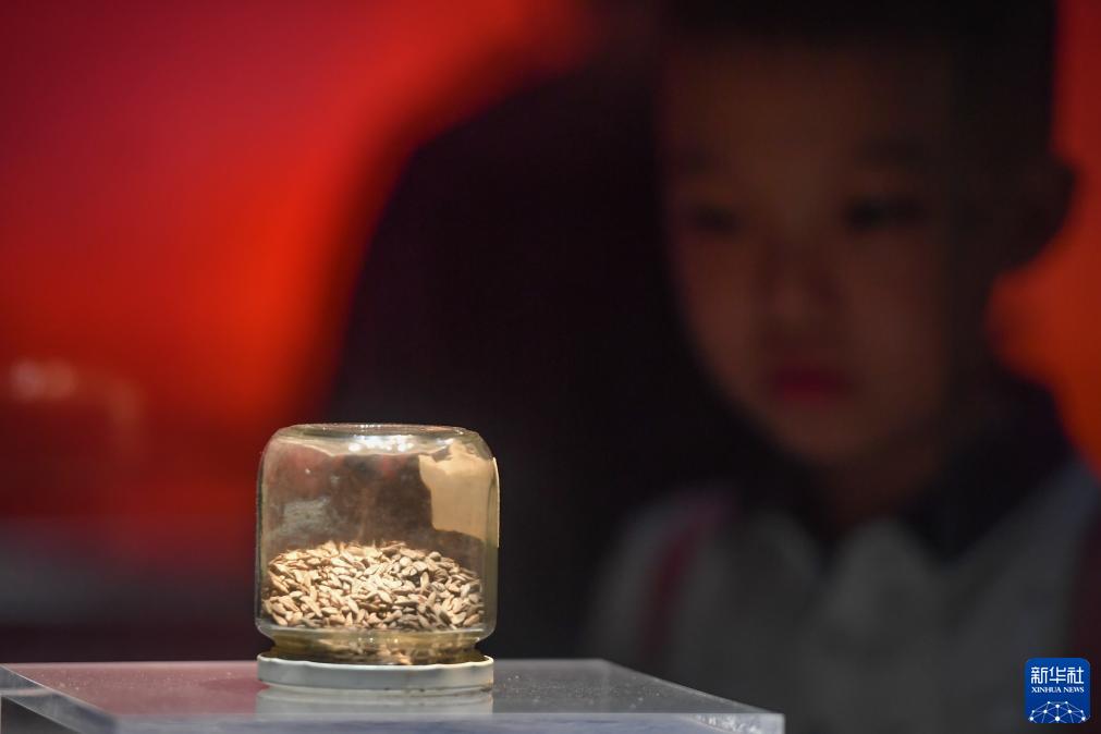 8月26日,在長(cháng)沙市芙蓉區的隆平水稻博物館,小朋友在參觀(guān)馬王堆1號漢墓出土的稻谷。