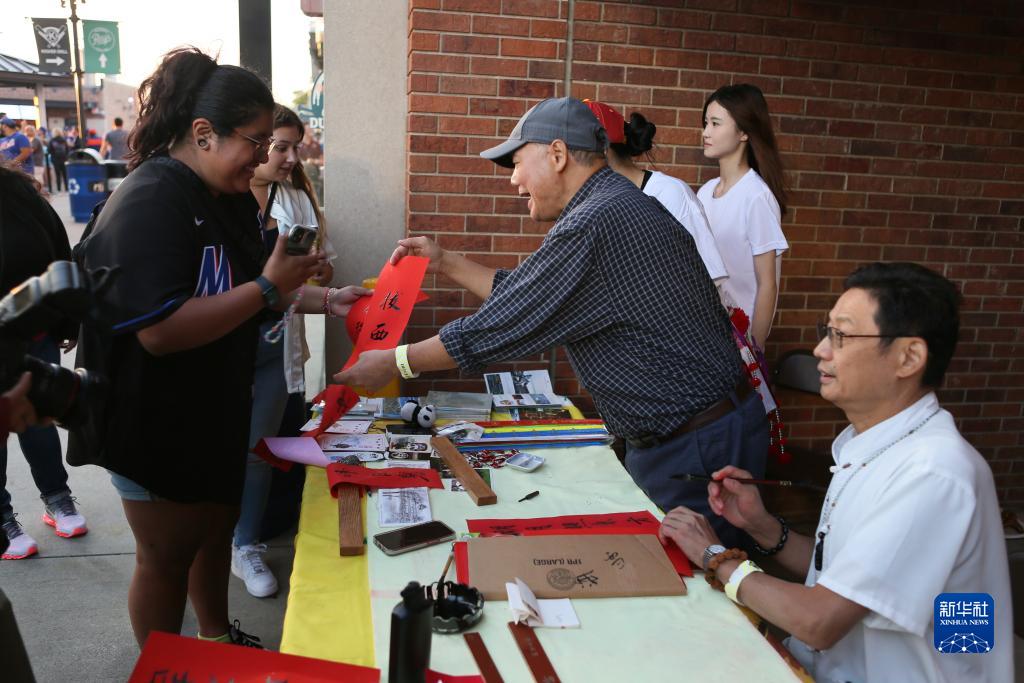 9月1日,在美國紐約大都會(huì )棒球隊主場(chǎng)花旗球場(chǎng)舉行的“中華之夜”暨“你好!中國”旅游推廣品牌發(fā)布活動(dòng)上,工作人員向觀(guān)眾贈送“墨寶”。