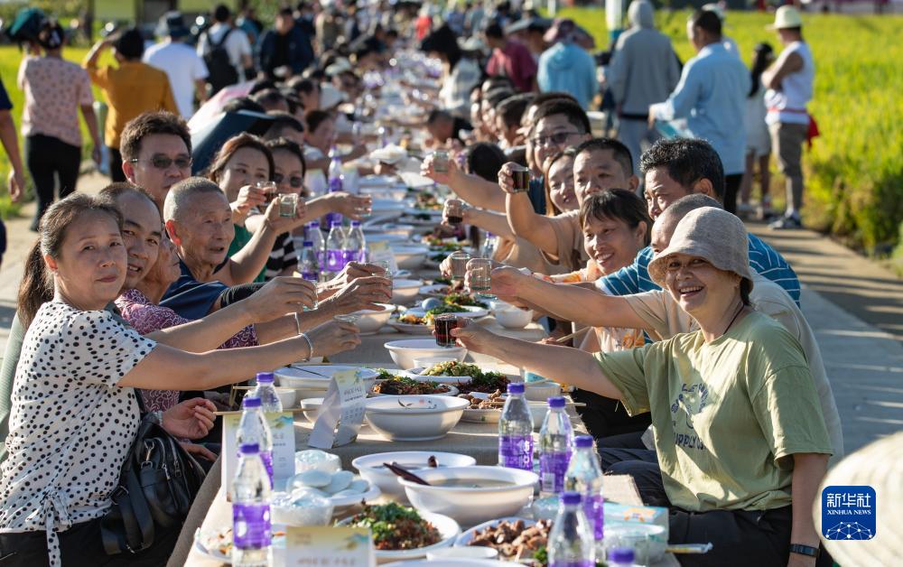 9月2日,在鹽邊縣惠民鎮興隆村的稻田邊,人們在豐收長(cháng)桌宴上享用當地傳統美食。
