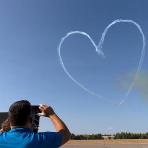 9月2日,觀(guān)眾在希臘塔納格拉空軍基地舉行的雅典飛行周上拍攝阿聯(lián)酋飛行表演隊的表演。