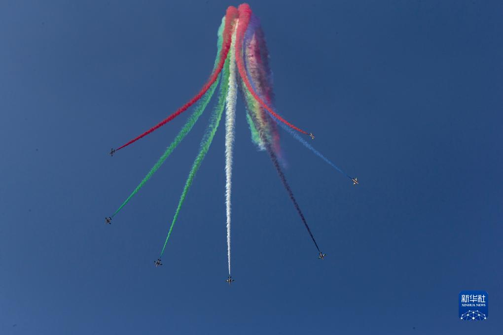 9月2日,在希臘塔納格拉空軍基地的雅典飛行周上,來(lái)自阿聯(lián)酋的飛行表演隊進(jìn)行表演。