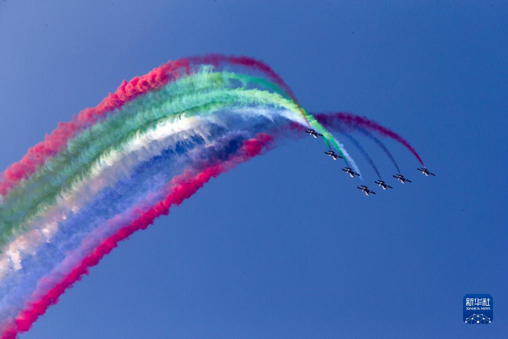 9月2日,在希臘塔納格拉空軍基地的雅典飛行周上,來(lái)自阿聯(lián)酋的飛行表演隊進(jìn)行表演。
