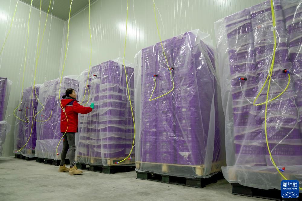 在新疆伽師縣粵伽新梅產(chǎn)業(yè)園內的德匯好物實(shí)驗工廠(chǎng),員工在帳式氣調庫內檢查儲存的新梅(9月2日攝)。