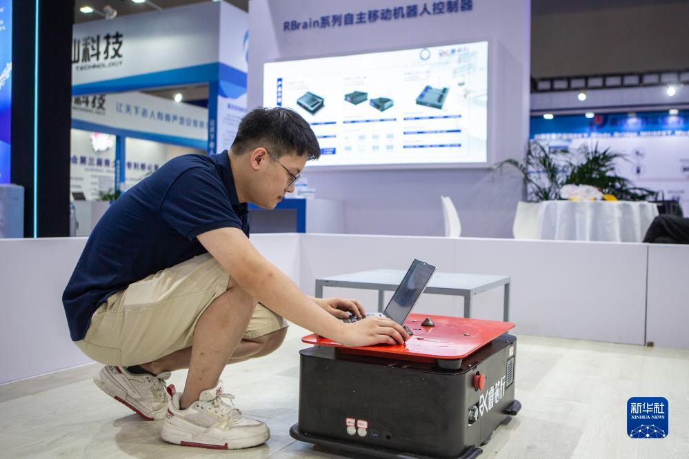 9月3日,參展商在2023中國國際智能產(chǎn)業(yè)博覽會(huì )會(huì )場(chǎng)內調試自主移動(dòng)機器人。