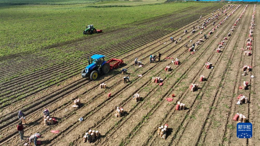 9月3日,河北省圍場(chǎng)滿(mǎn)族蒙古族自治縣御道口鎮御道口村一家馬鈴薯種植合作社社員在收獲馬鈴薯(無(wú)人機照片)。