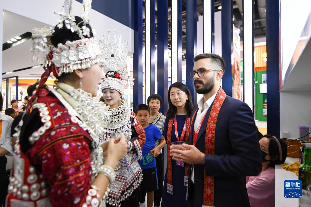 9月3日,在國家會(huì )議中心綜合展區的英國展館,來(lái)自貴州省黔東南州的演員與英國展館工作人員(前右一)交流。