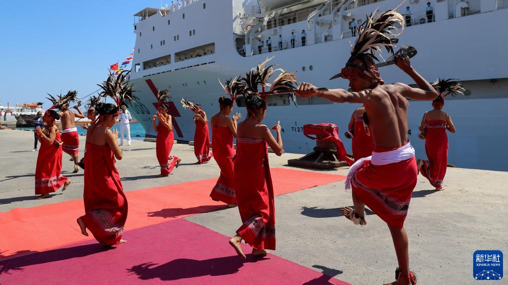 9月3日,中國海軍“和平方舟”號醫院船抵達東帝汶帝力港,當地民眾表演特色歌舞歡迎。