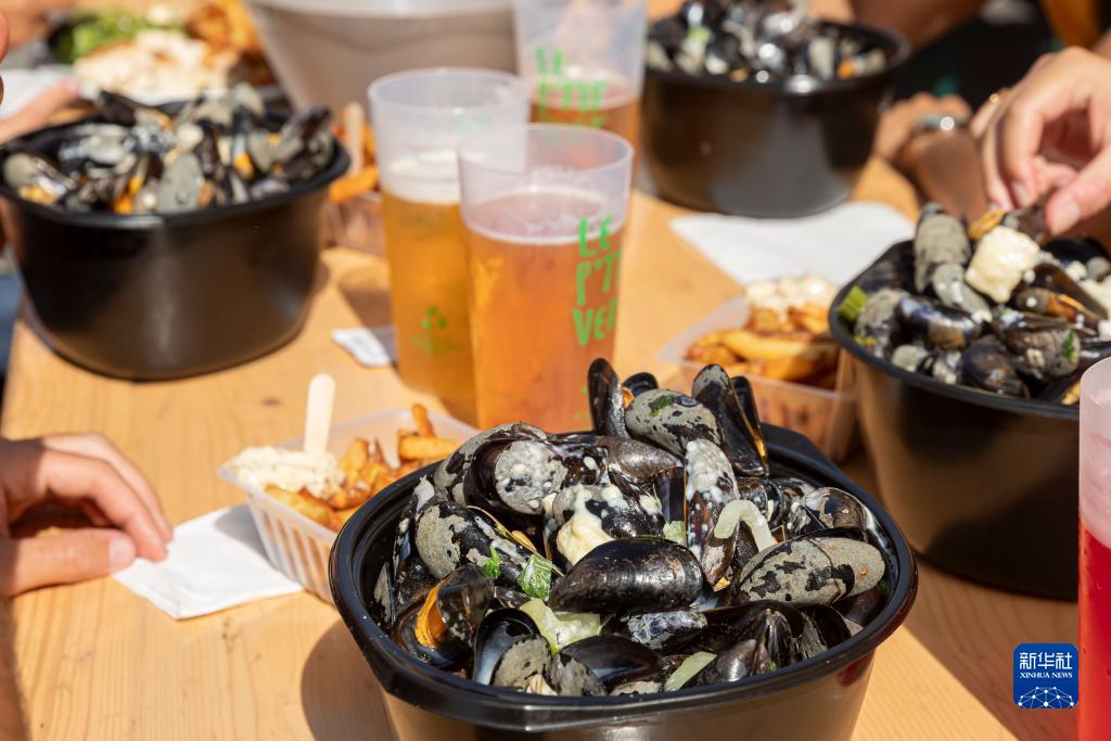 9月3日,在法國里爾舊貨市場(chǎng)上,人們享用貽貝、薯條和啤酒。