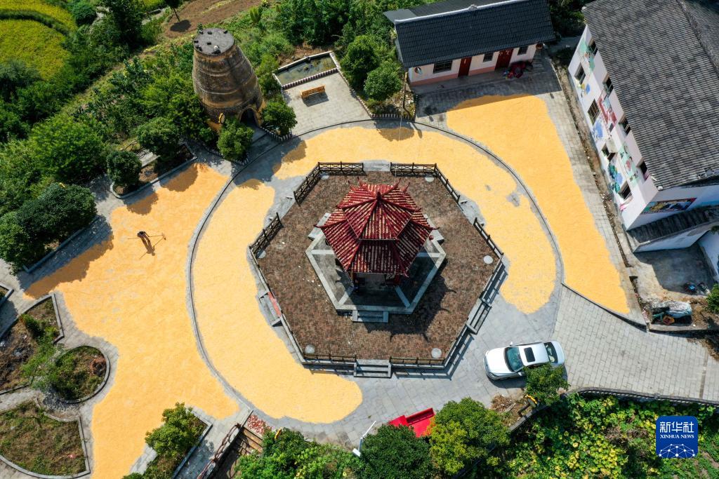 9月3日,村民在貴州省遵義市播州區新民鎮中心村晾曬玉米(無(wú)人機照片)。