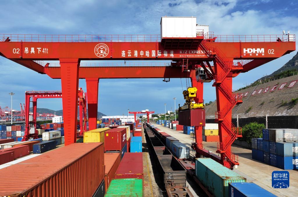 9月4日,在江蘇省連云港市中哈連云港物流合作基地,大型機械在吊裝集裝箱(無(wú)人機照片)。
