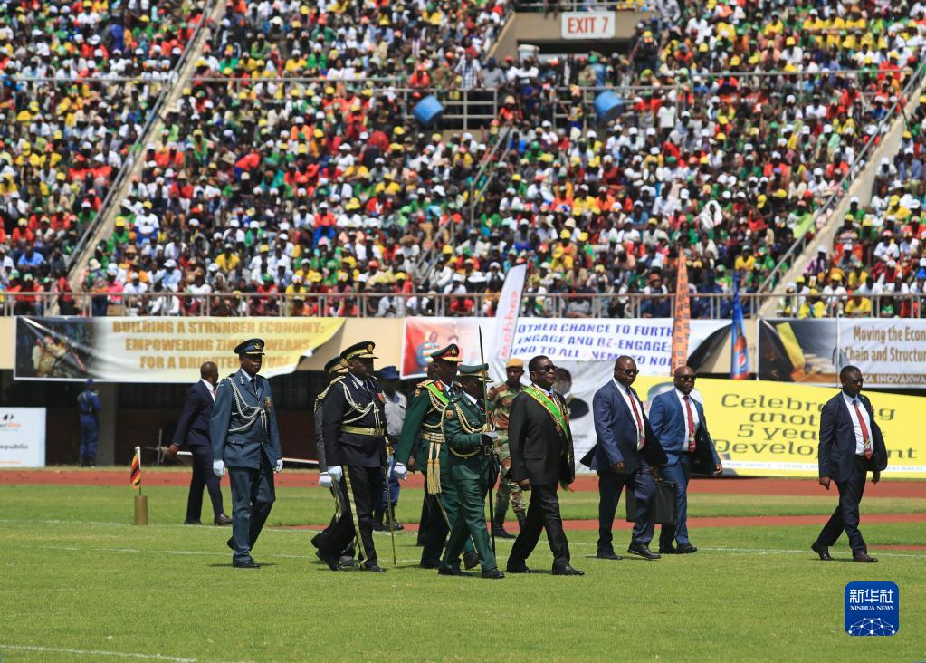 9月4日,在津巴布韋首都哈拉雷的國家體育場(chǎng),津巴布韋當選總統姆南加古瓦(右四)在就職典禮上檢閱儀仗隊。