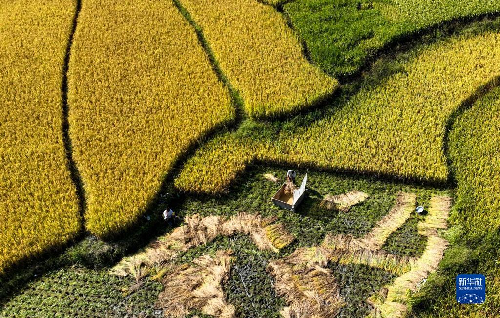 9月5日,村民在貴州省開(kāi)陽(yáng)縣禾豐鄉底窩壩水稻種植示范區收割水稻(無(wú)人機照片)。