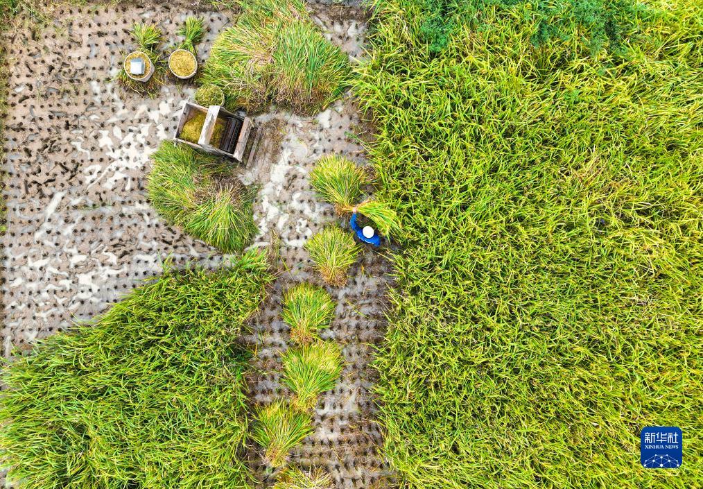 9月4日,湖南省常寧市洋泉鎮杉樹(shù)村村民在收獲水稻(無(wú)人機照片)。
