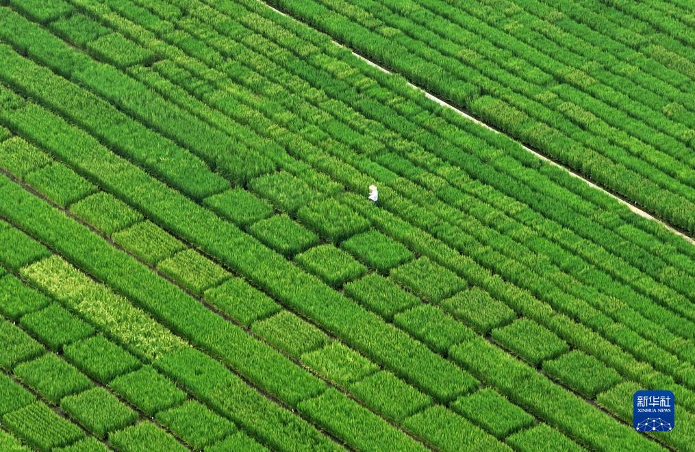 9月4日,農民在江蘇里下河地區農科所(揚州市農科院)試驗田里勞作(無(wú)人機照片)。