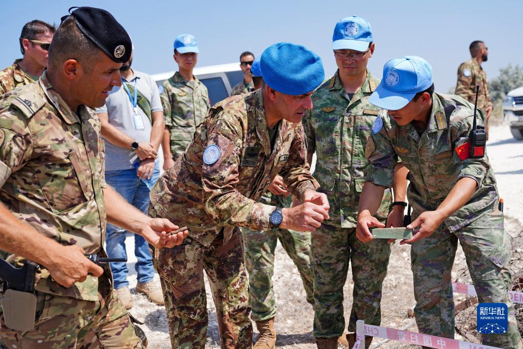 9月4日,在黎巴嫩南部“藍線(xiàn)”附近雷場(chǎng),聯(lián)合國駐黎巴嫩臨時(shí)部隊(聯(lián)黎部隊)西區司令喬瓦尼·布拉法準將(中)查看銷(xiāo)毀地雷的殘片。