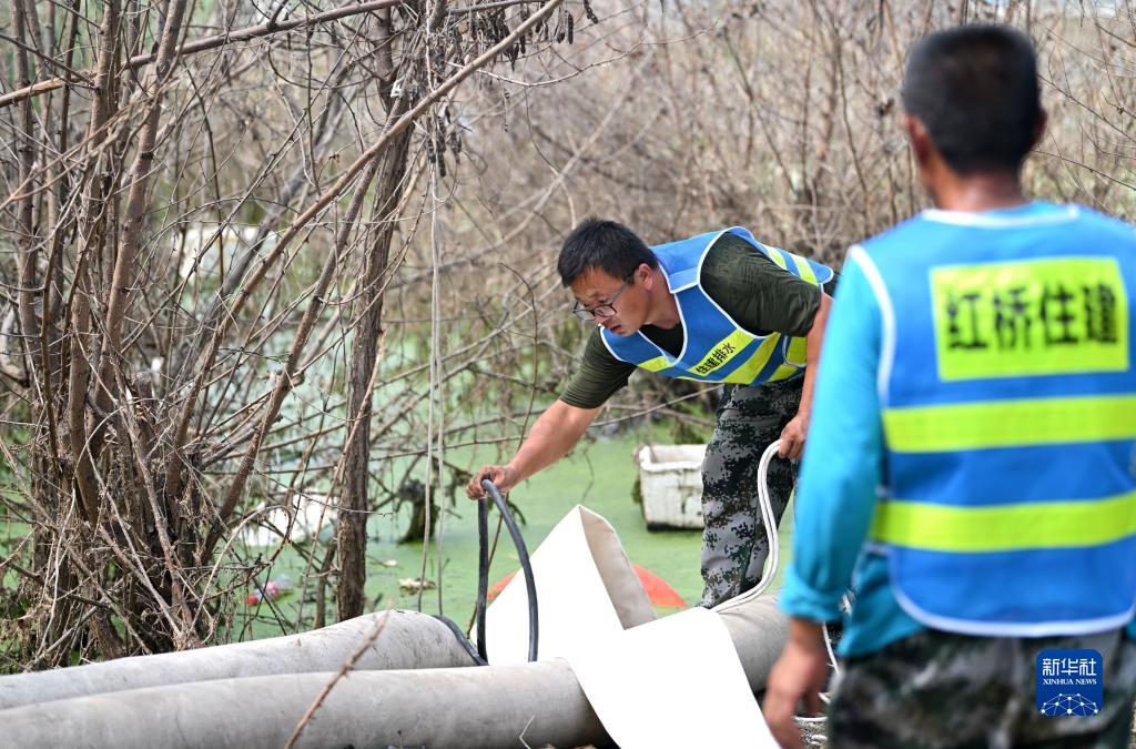 9月5日,在天津市西青區辛口鎮第六埠村,排水作業(yè)人員準備放置潛水泵。