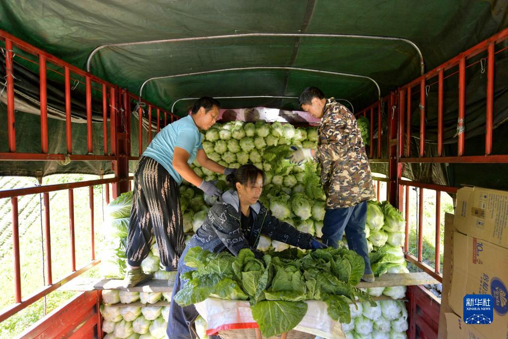 9月5日,在湖北省宣恩縣椿木營(yíng)鄉挖斷山村,農民將大白菜裝車(chē)。