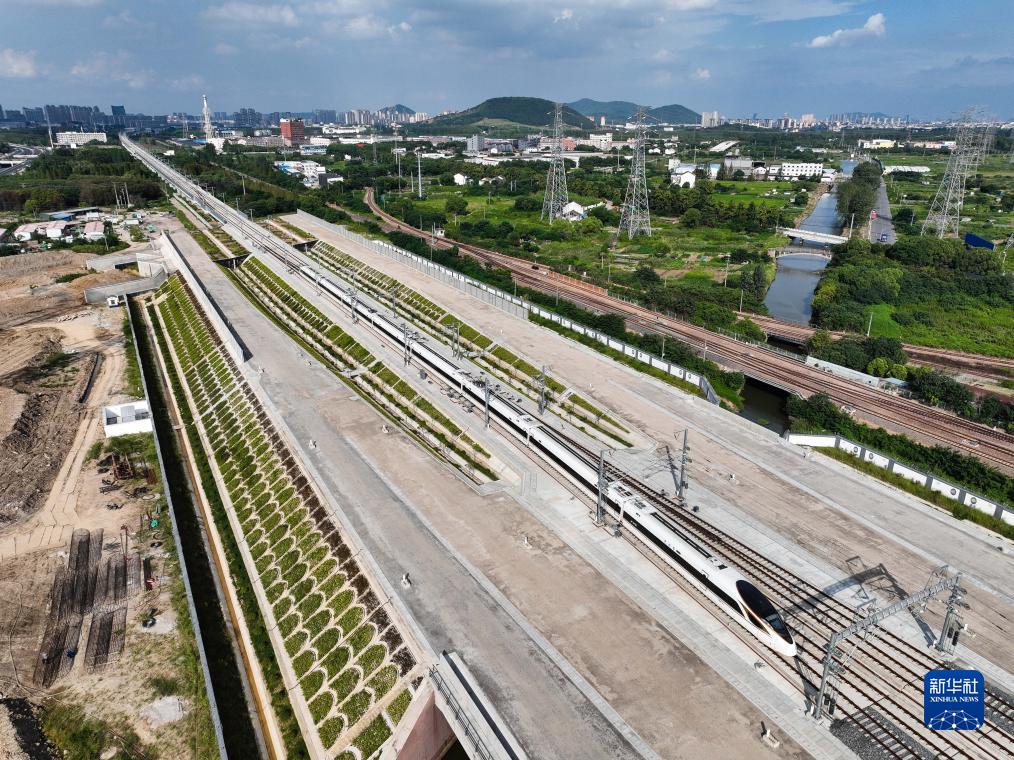 9月5日,一列試運行列車(chē)駛過(guò)江陰站(無(wú)人機照片)。