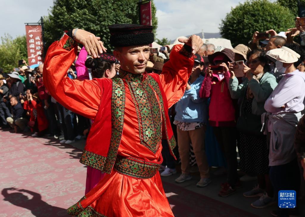 在新疆塔什庫爾干塔吉克自治縣帕米爾旅游區游客服務(wù)中心,縣文工團演員跳舞歡迎游客(9月4日攝)。