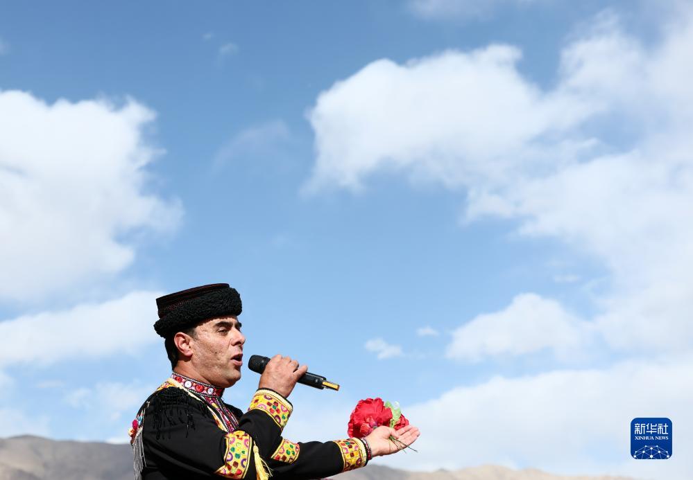 在新疆塔什庫爾干塔吉克自治縣帕米爾旅游區游客服務(wù)中心,縣文工團演員唱歌歡迎游客(9月4日攝)。